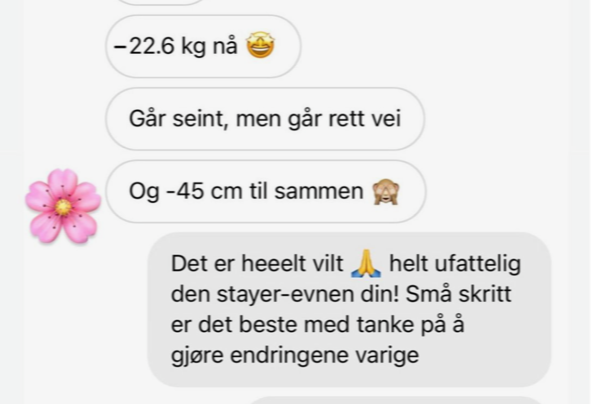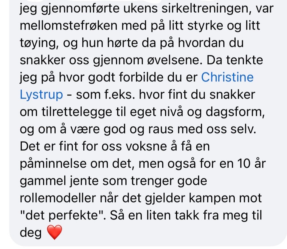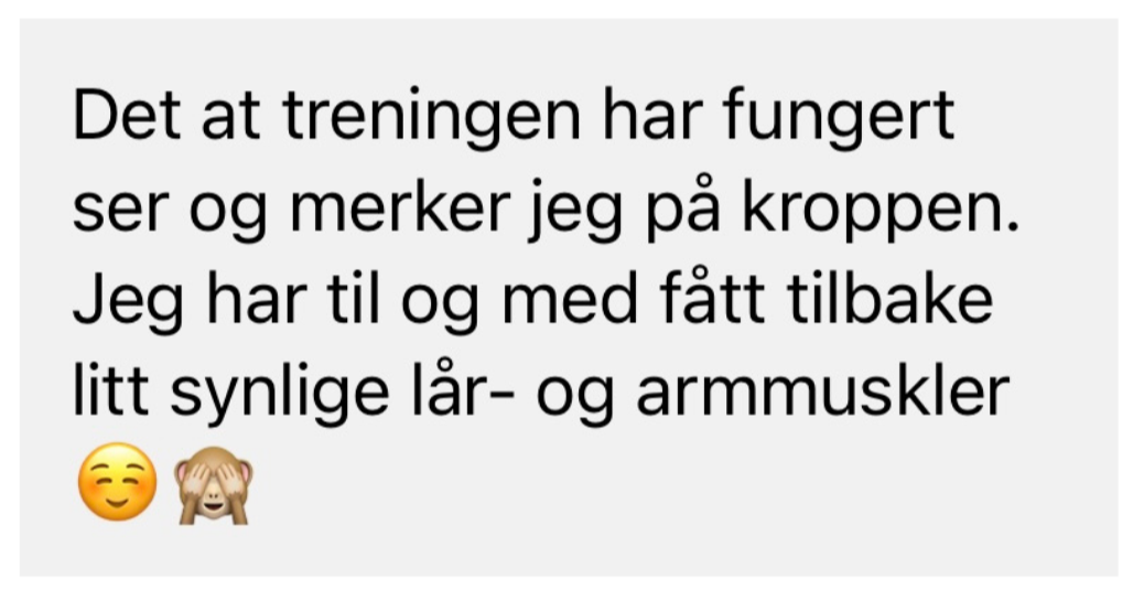 "Jeg er veldig glad for at jeg meldte meg på onlinetreningen med Christine. Jeg ønsket å øke treningsmengden og med onlinetreningen er jeg fleksibel å trene når det passer meg. Samtidig er det mye lettere å komme over dørstokken etter en dag med jobb og barn hvis jeg har en treningsøkt liggende som venter å bli gjennomført. Rygg- og knesmerter er så å si borte og jeg merker allerede at jeg har blitt sterkere, føler meg bedre i kroppen min og har mer energi."
